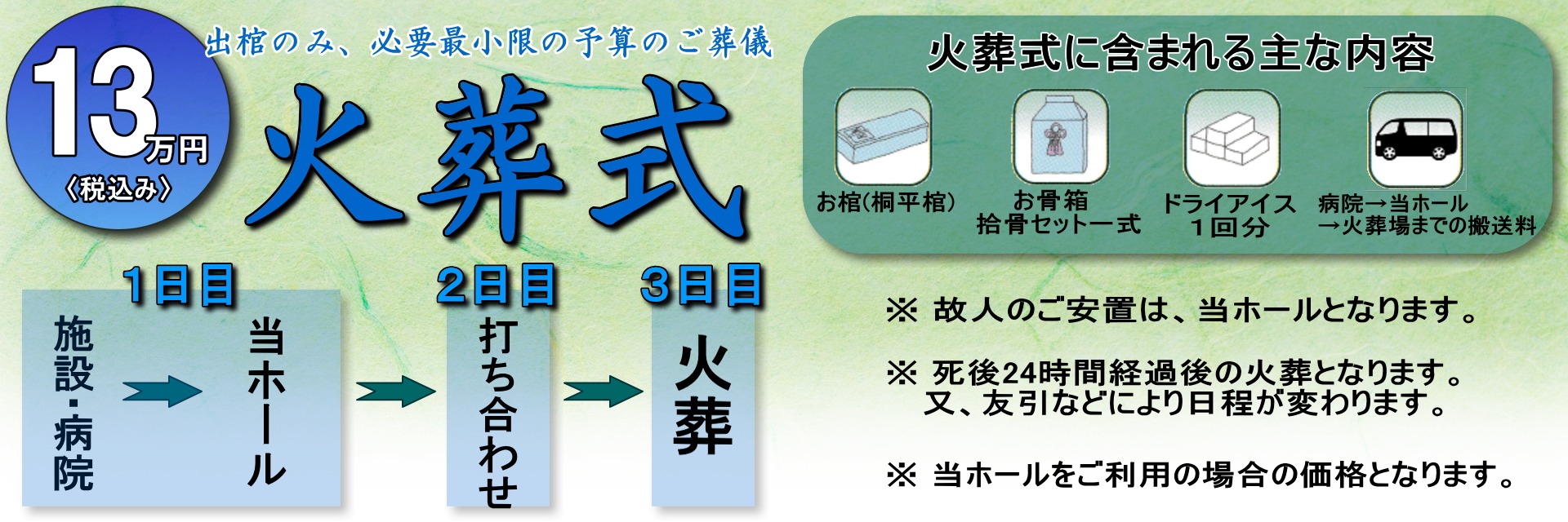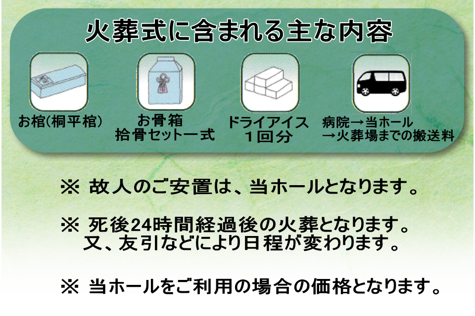 ※ご遺体の安置が、当ホール以外(ご自宅や他の式場)の場合の直葬・火葬式は、積み上げ式のお見積りとなります。